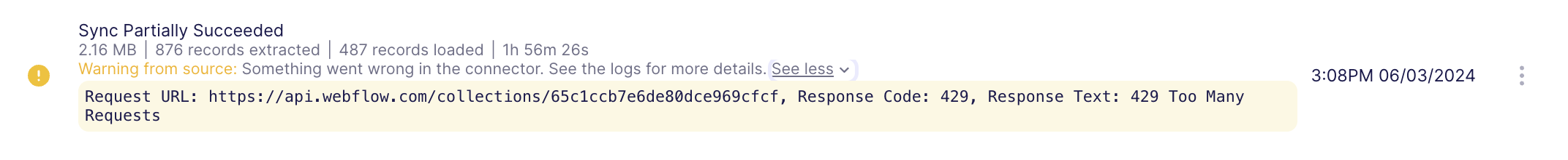 Airbyte shows sync errors in yellow. These can range from transient errors to warnings from the source, like rate limiting. In most cases, these types of errors resolve themselves without any action required.